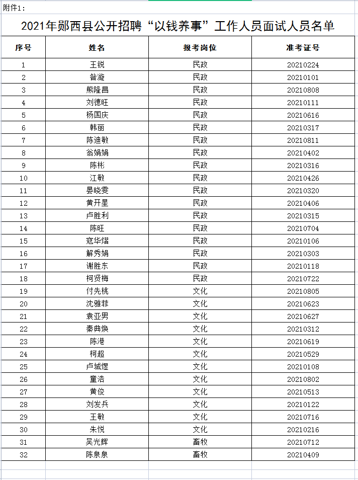 附件1:2021年郧西县公开招聘“以钱养事”工作人员面试人员名单